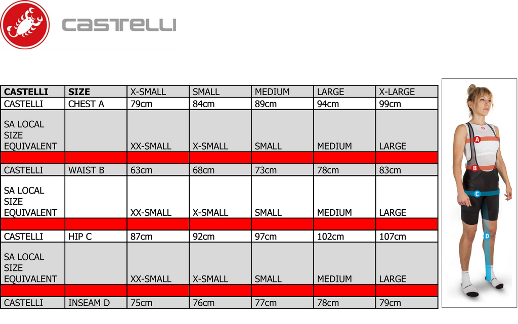 Castelli as a performnace brand and majority European made does size smaller than most local cycling brands. Please up-size ONE from what you would be in SA sizing. Please note the size chart is abasic guide and it is suggested to size up TWO sizes should you fall between two sizes.